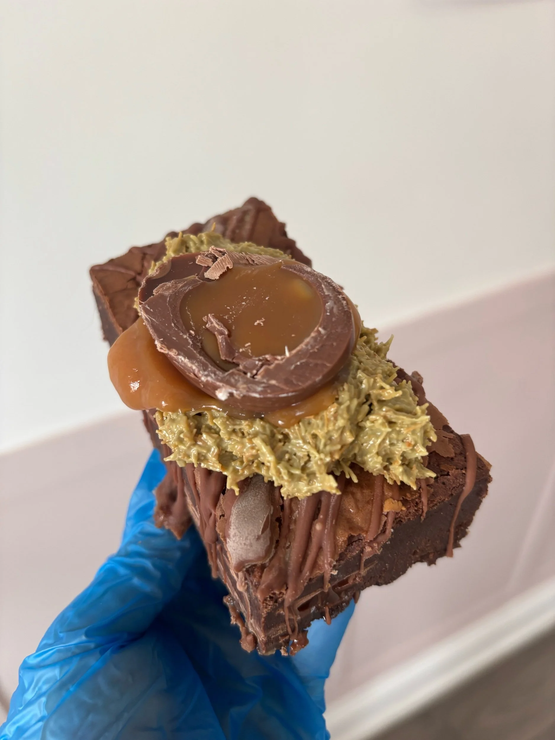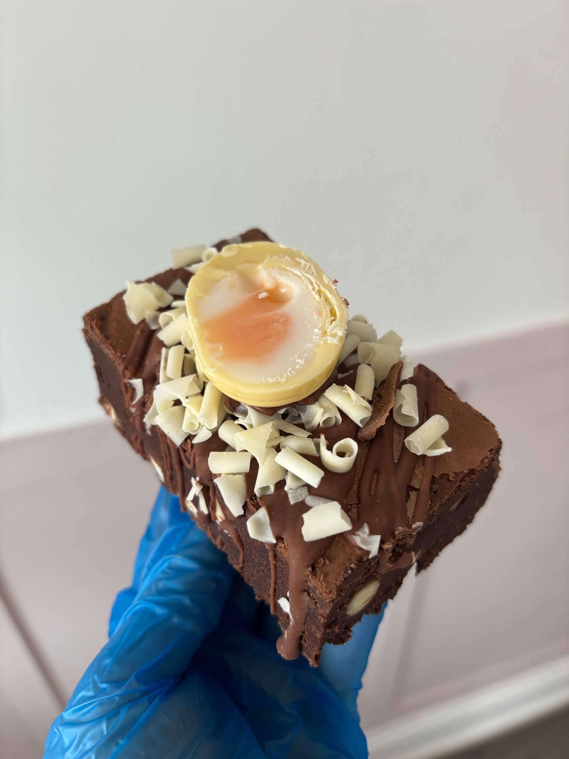 Triple chocolate creme egg brownie - Our fudgy, rich brownie filled with white chocolate chips, drizzled in dairy milk chocolate, topped with white chocolate curls & a half a white chocolate creme egg.