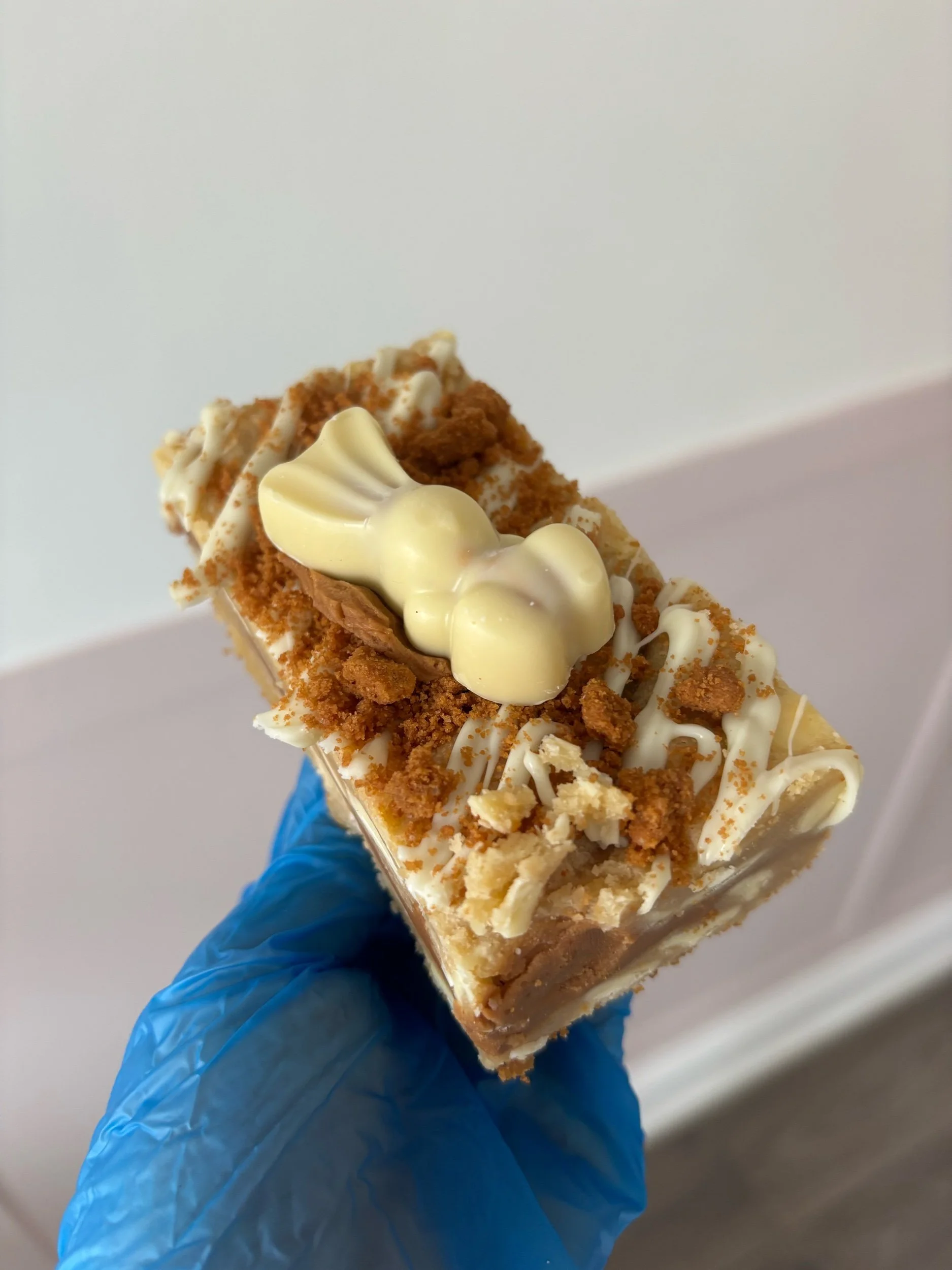 Biscoff White Chocolate Cookie Bar - Our white chocolate cookie dough with Biscoff and white chocolate spread layer in the middle, topped with white chocolate drizzle, Biscoff crumb and a white chocolate Malteser bunny.