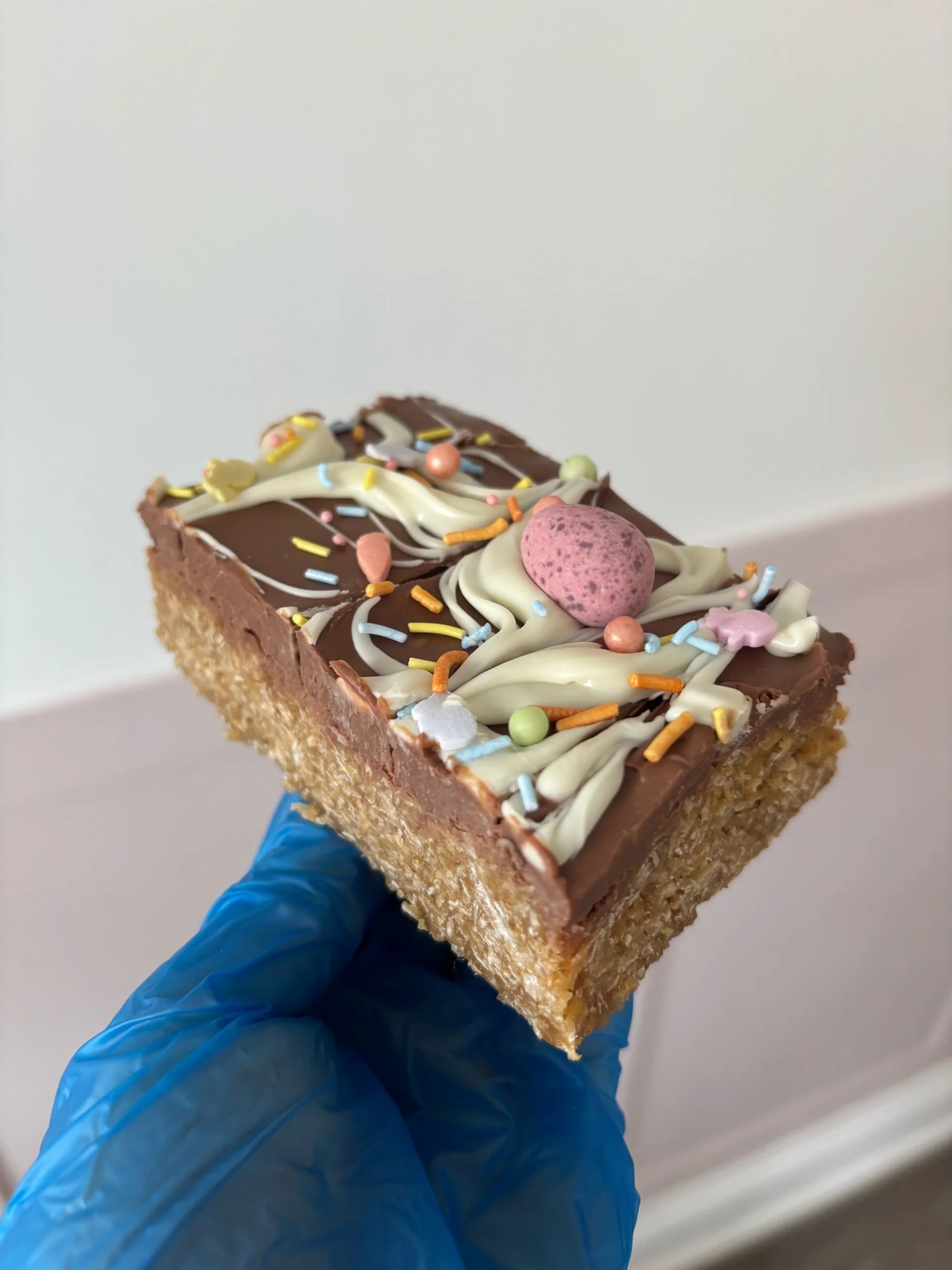 Double Chocolate Mini Egg Flapjack - Our sticky, syrup-y flapjack base topped with dairy milk, feathered with white chocolate, loaded with mini eggs and Easter sprinkles.